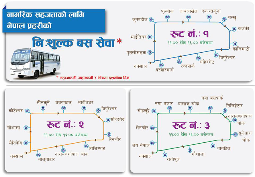 अष्टमी, नवमी र विजया दशमीको दिन दिउँसो ११ देखि ४ बजेसम्म काठमाडौंको तीनवटा रुटमा निशुल्क बस सञ्चालन गर्ने नेपाल प्रहरीले जनाएको छ ।