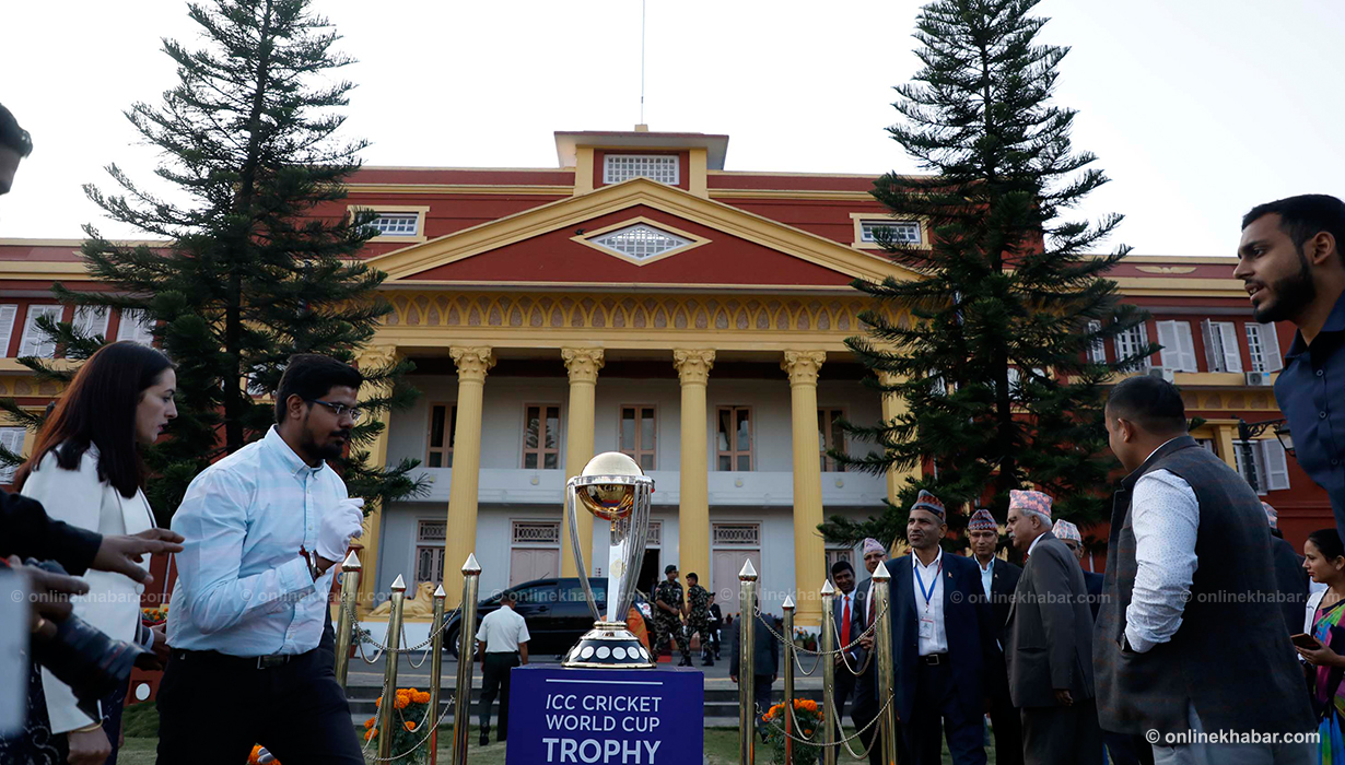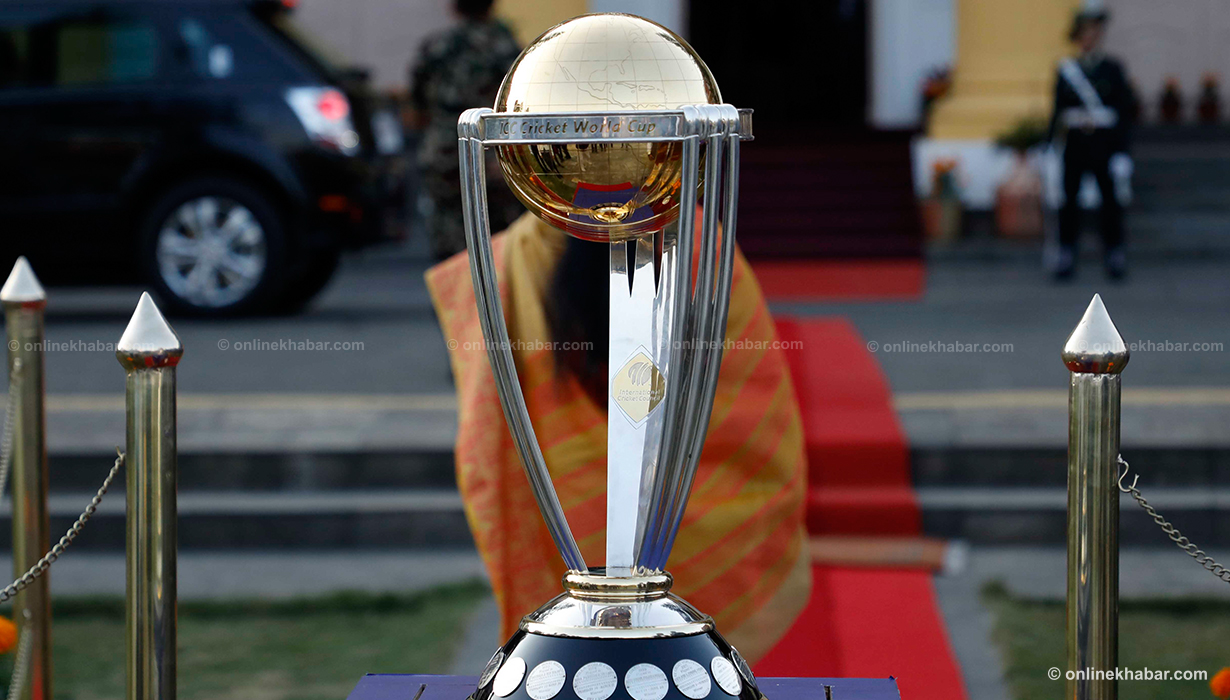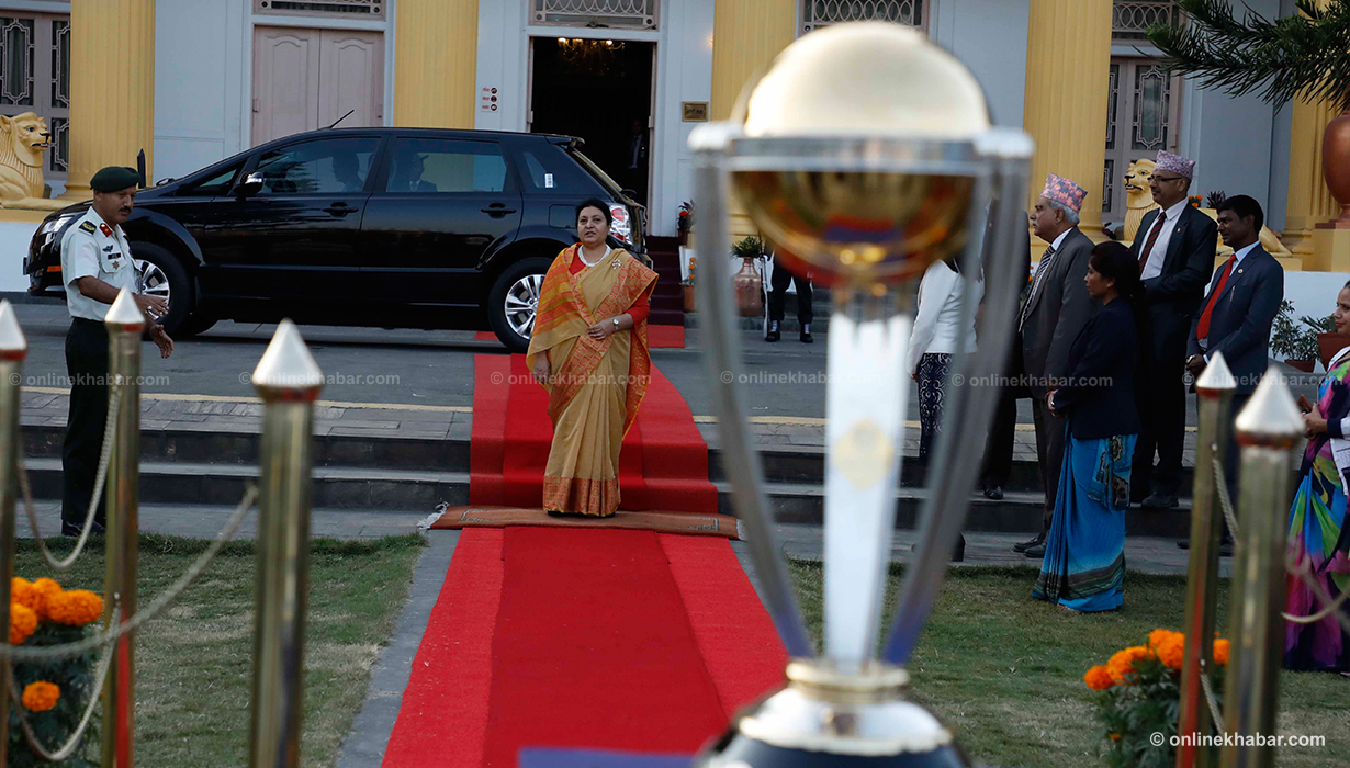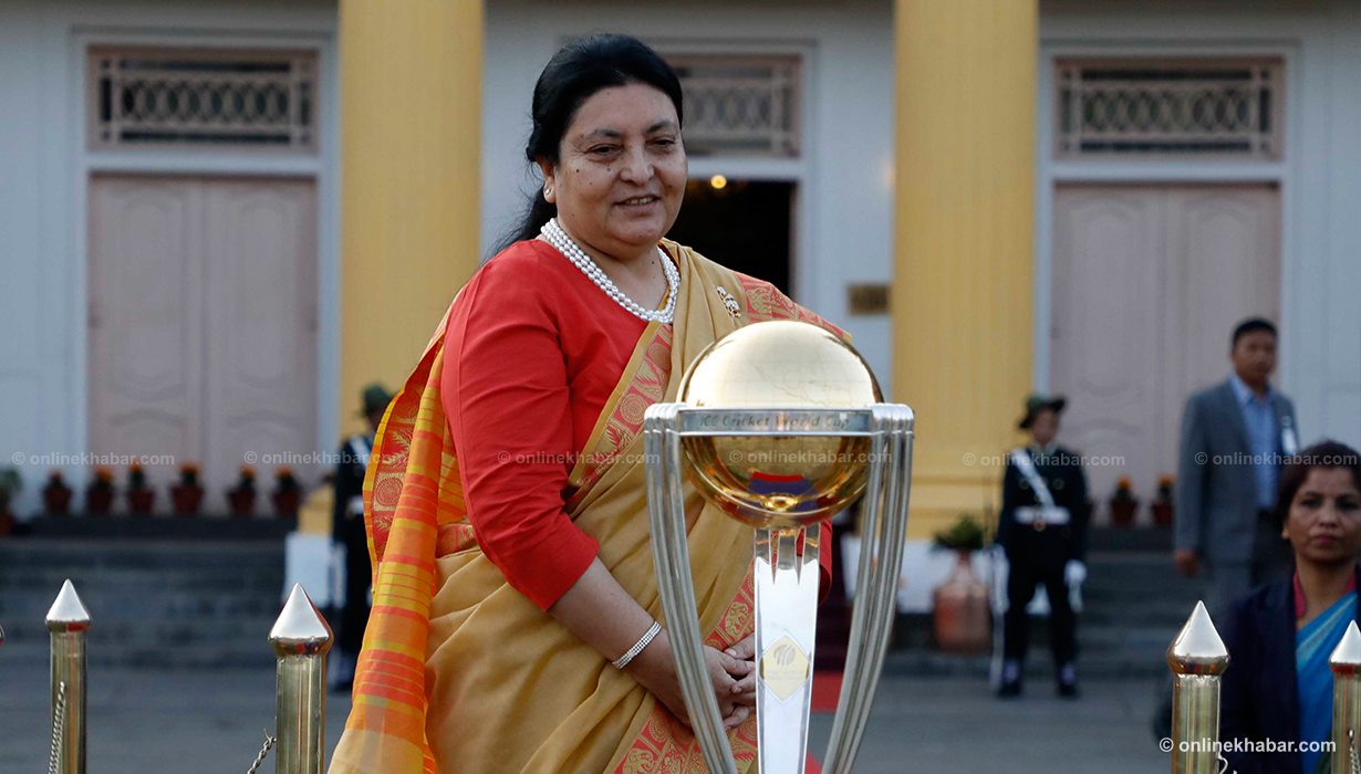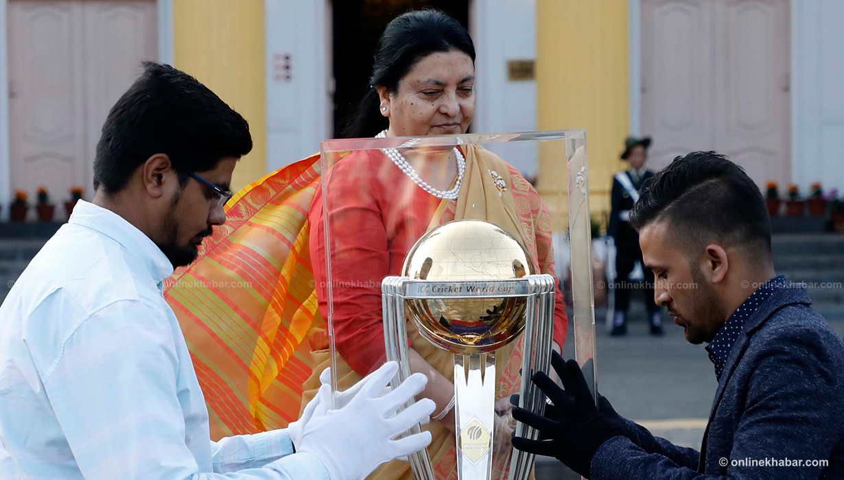 ११ कात्तिक, काठमाडौं । आईसीसी विश्वकप क्रिकेटको ट्रफी राष्ट्रपति विद्यादेवी भण्डारीको हातमा पुगेको छ । वर्ल्ड टुरका क्रममा काठमाडौं ल्याइएको विश्वकप क्रिकेटको ट्रफी शीतल निवास पनि पुर्याइएको हो ।