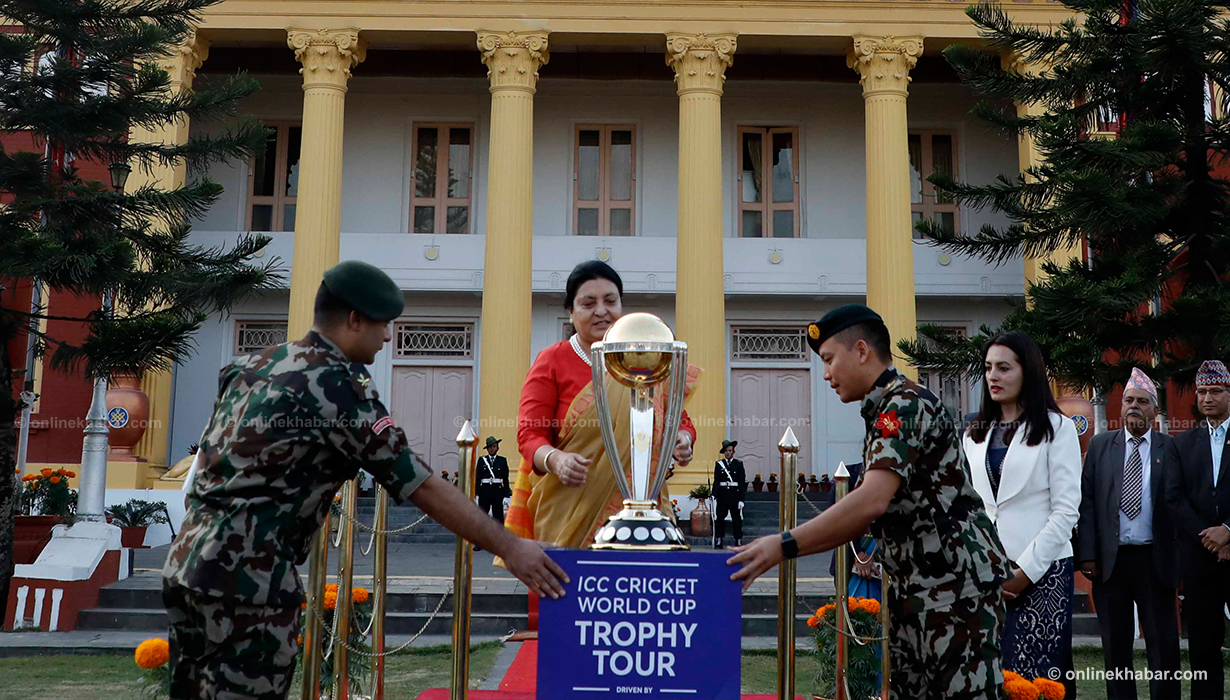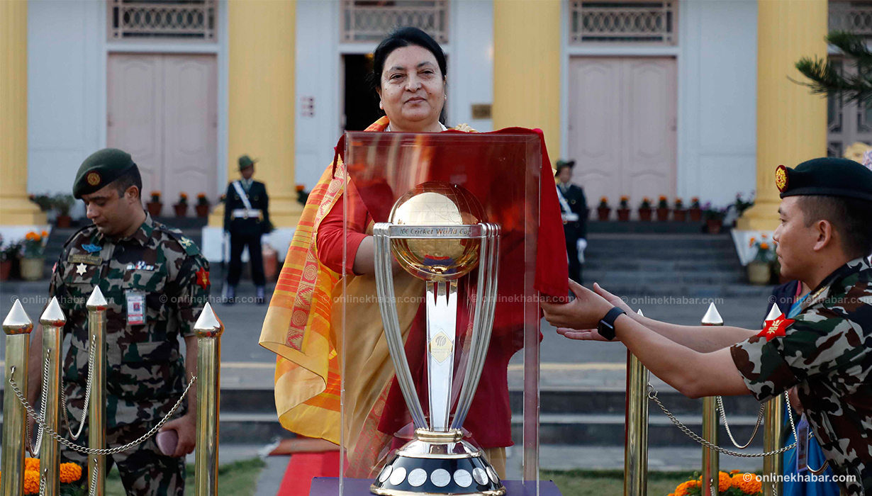 ११ कात्तिक, काठमाडौं । आईसीसी विश्वकप क्रिकेटको ट्रफी राष्ट्रपति विद्यादेवी भण्डारीको हातमा पुगेको छ । वर्ल्ड टुरका क्रममा काठमाडौं ल्याइएको विश्वकप क्रिकेटको ट्रफी शीतल निवास पनि पुर्याइएको हो ।