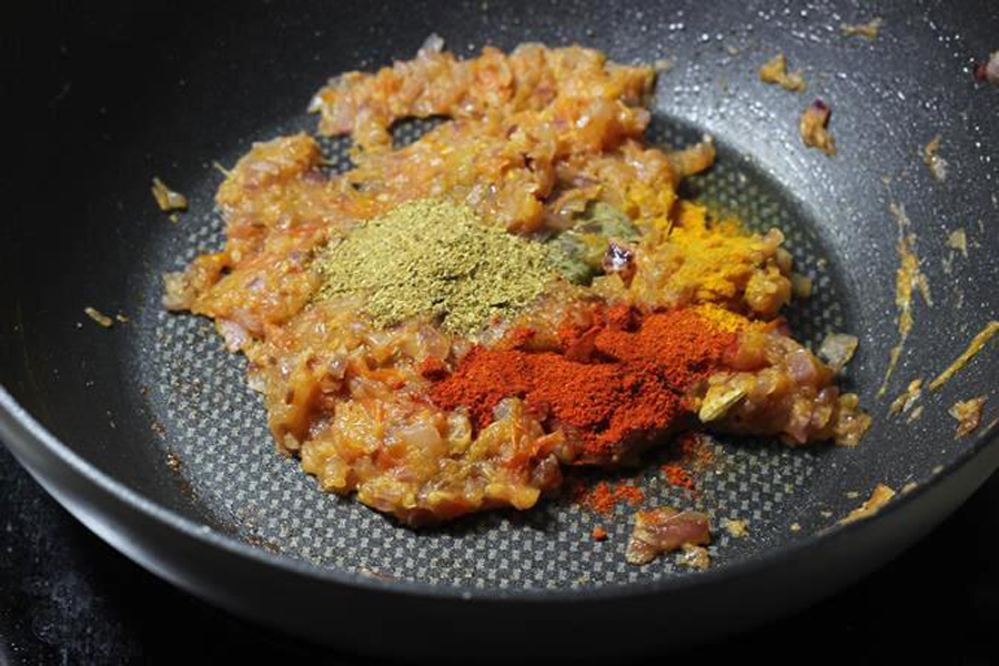 त्यसपछि उक्त पेस्टमा काटेको पुदिनालाई हालेर केहीबेर चलाउनु पर्छ । ताकी पुदिराको गन्ध हराओस् । अब उक्त पेस्टमा बेसार, जिरा पाउडर, नुन तथा रातो खुर्सानी हालेर राम्ररी चलाउनु पर्छ र मसलालाई राम्ररी फ्राई हुन दिनु पर्छ ।