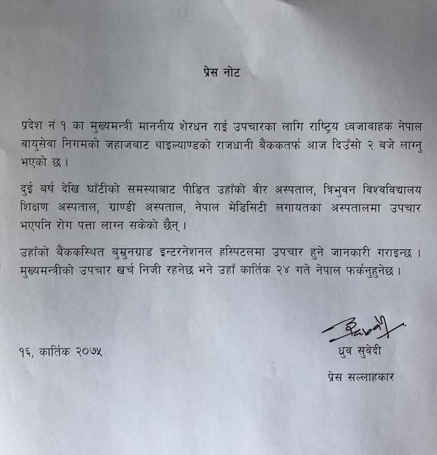 उनी नेपाल वायु सेवा निगमको जहाजबाट उपचारका लागि दिउँसो २ बजे थाइल्याण्ड प्रस्थान गरेका हुन् । उनले निजी खर्चमा नै उपचार गर्न त्यसतर्फ गएको बताएका छन् ।