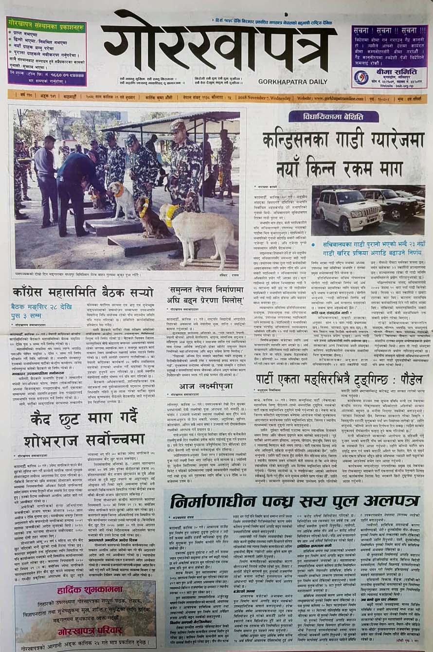 २१ कात्तिक, काठमाडौं । राजधानी काठमाडौंबाट आज प्रकाशित राष्ट्रिय दैनिक पत्रिकाहरुले तिहारसँग सम्बन्धित सामग्रीका साथै कांग्रेस उपसभापतिमा विजय गच्छदारको मनोनयनले कांग्रेसमा विवाद बढेको, पूर्वराजदूतको हत्यारा ७८ दिनसम्म पत्ता नलागेकोलगायत विषयलाई प्राथमिकताका साथ छापेका छन् ।