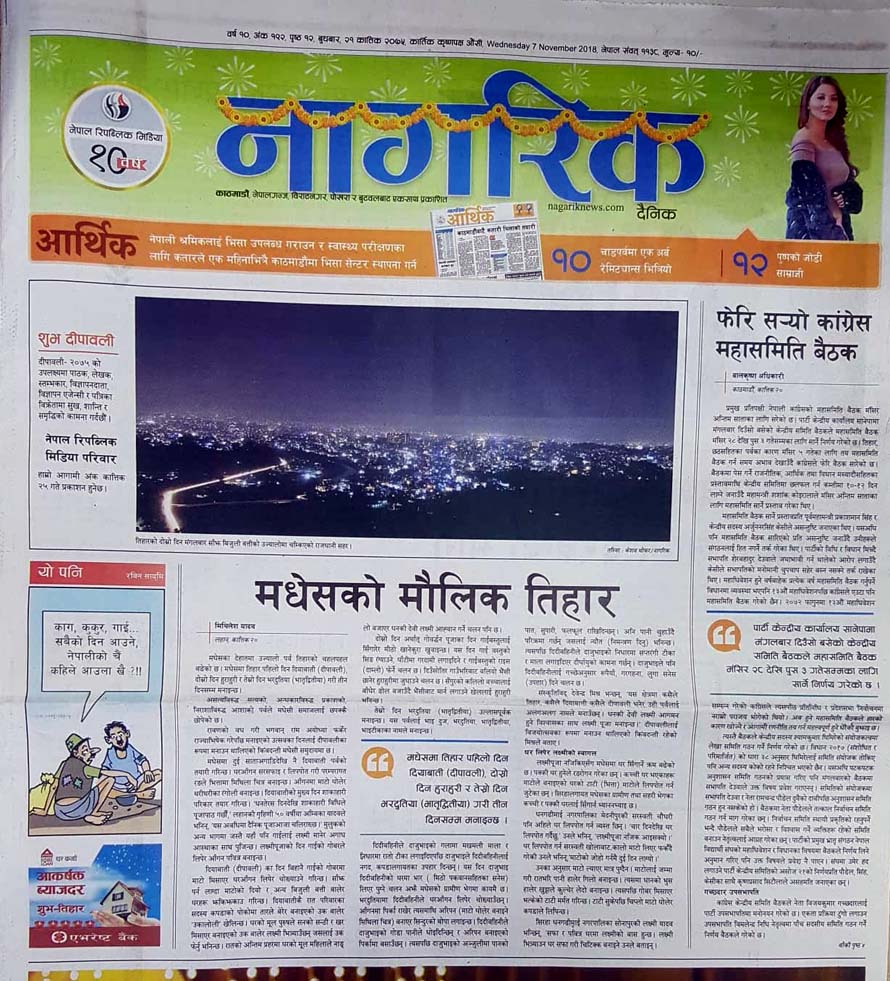 नागरिकको प्रथम पृष्ठमा मधेसको मौलिक तिहारको चर्चासँगै कांग्रेस महासमिति बैठक सरेको समाचार छ ।