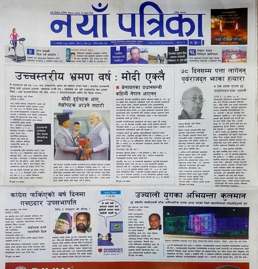 अन्नपूर्णले ‘उच्चस्तरीय भ्रमण वर्षः मोदी एक्लै’ शीर्षक दिएर प्रमुख समाचार लेखेको छ ।
