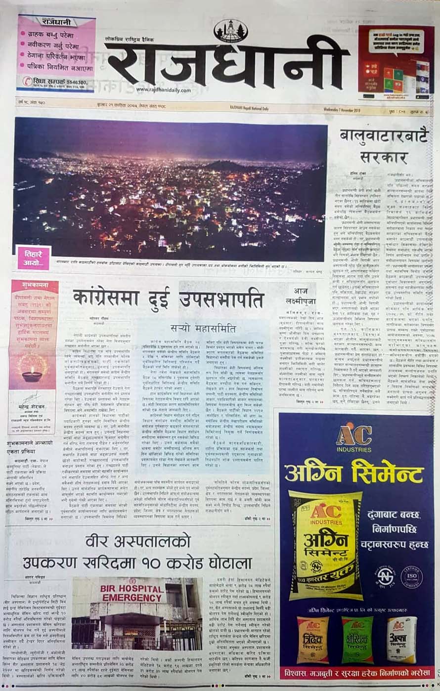 राजधानीले प्रधानमन्त्री केपी शर्मा ओली तीन सातादेखि सिंहदरबार नगएको र बालुवाटारबाटै सरकार चलाएको लेखेको छ । वीर अस्पतालको उपकरण खरिदमा भएको १० करोड घोटालालाई राजधानीले एंकर बनाएको छ ।