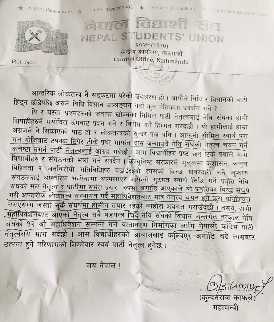 काठमाडौं । पार्टी नेतृत्वले नै नेपाल विद्यार्थी संघ (नेविसंघ) को १२ औं अधिबेशन हुन नदिएको महामन्त्री कुन्दन काफ्ले समूहले आरोप लगाएको छ ।