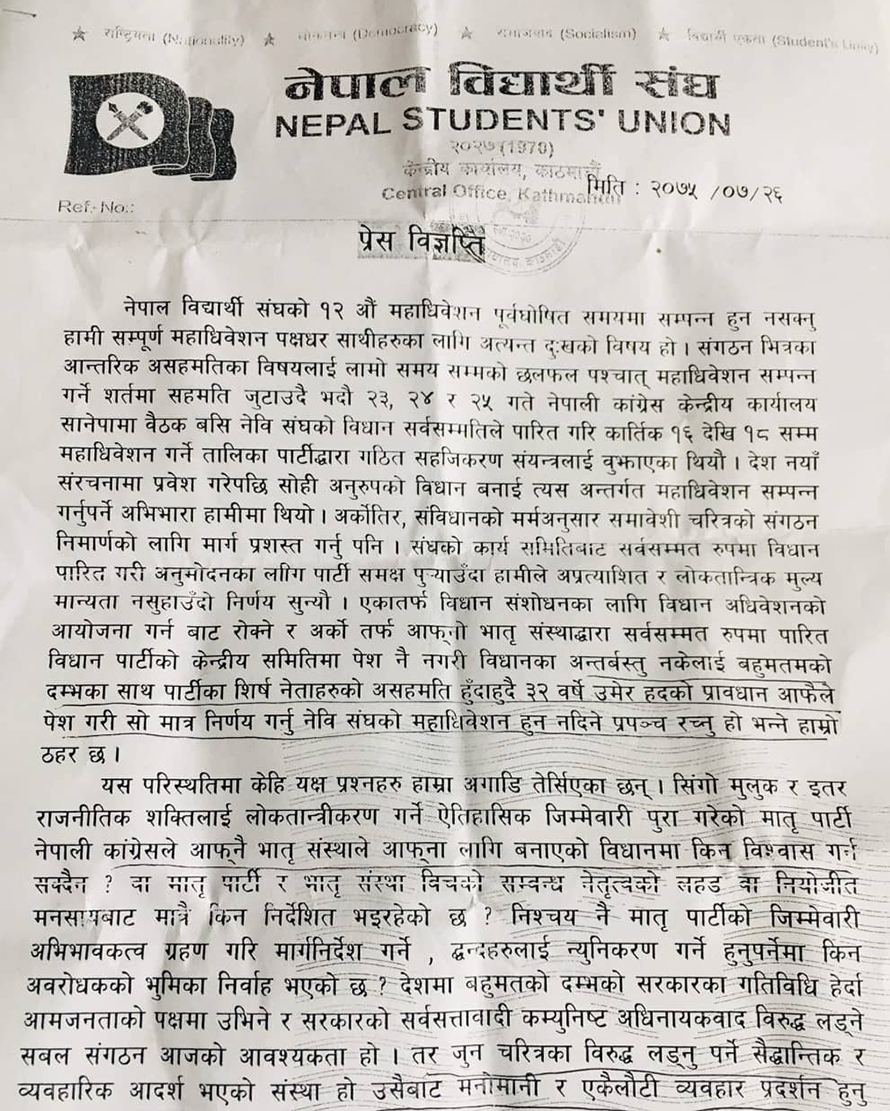 नेविसंघले सर्वसम्मत रुपमा पारित गरेको विधानलाई पार्टीका नेताहरुकै असहमति हुँदाहुँदै जवरजस्ती ३२ वर्षे उमेर हदको निर्णय गर्नु अधिबेशन रोक्ने प्रपञ्च भएको उक्त समूहको आरोप छ ।