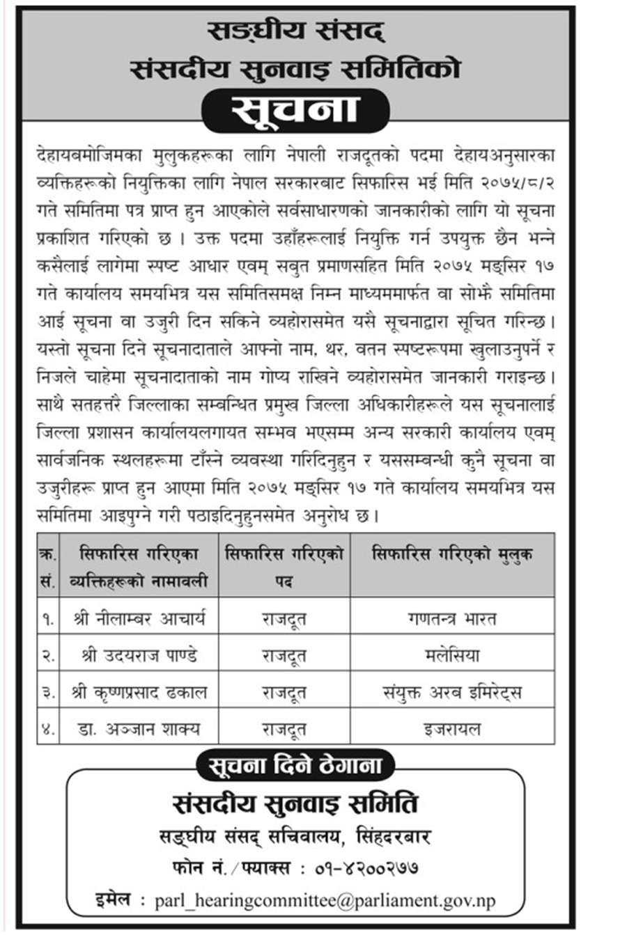 राजदूतमा सिफारिस व्यक्ति नियुक्तिका लागि अयोग्य लागेमा स्पष्ट आधार तथा सबुत प्रमाणसहित उजुरी पेश गर्न समितिले आह्वान गरेको छ ।