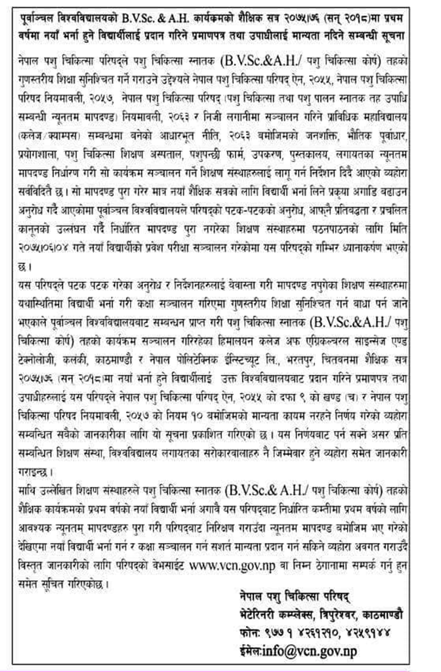 पूर्वाञ्चल विश्वविद्यालयले मापदण्ड पूरा नगरेका कलेजमा बी.भी.एससी एण्ड ए. एच कार्यक्रमका लागि भर्ना आहृवान गरेसँगै परिषदले त्यस्ता कलेजहरुको उपाधिलाई मान्यता नदिने प्रष्ट पारेको हो ।