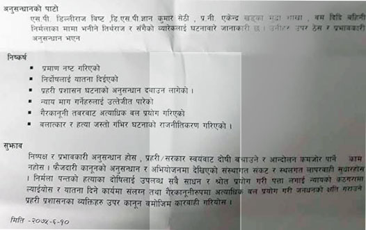 उसले सबै स्रोत साधन प्रयोग गरी हत्यारालाई पत्ता लगाउन र निर्दोषलाई यातना दिने तथा अत्यधिक बल प्रयोग गर्ने प्रहरी प्रशासनका अधिकारीमाथि पनि कारबाही गर्न माग गरेका छन् ।