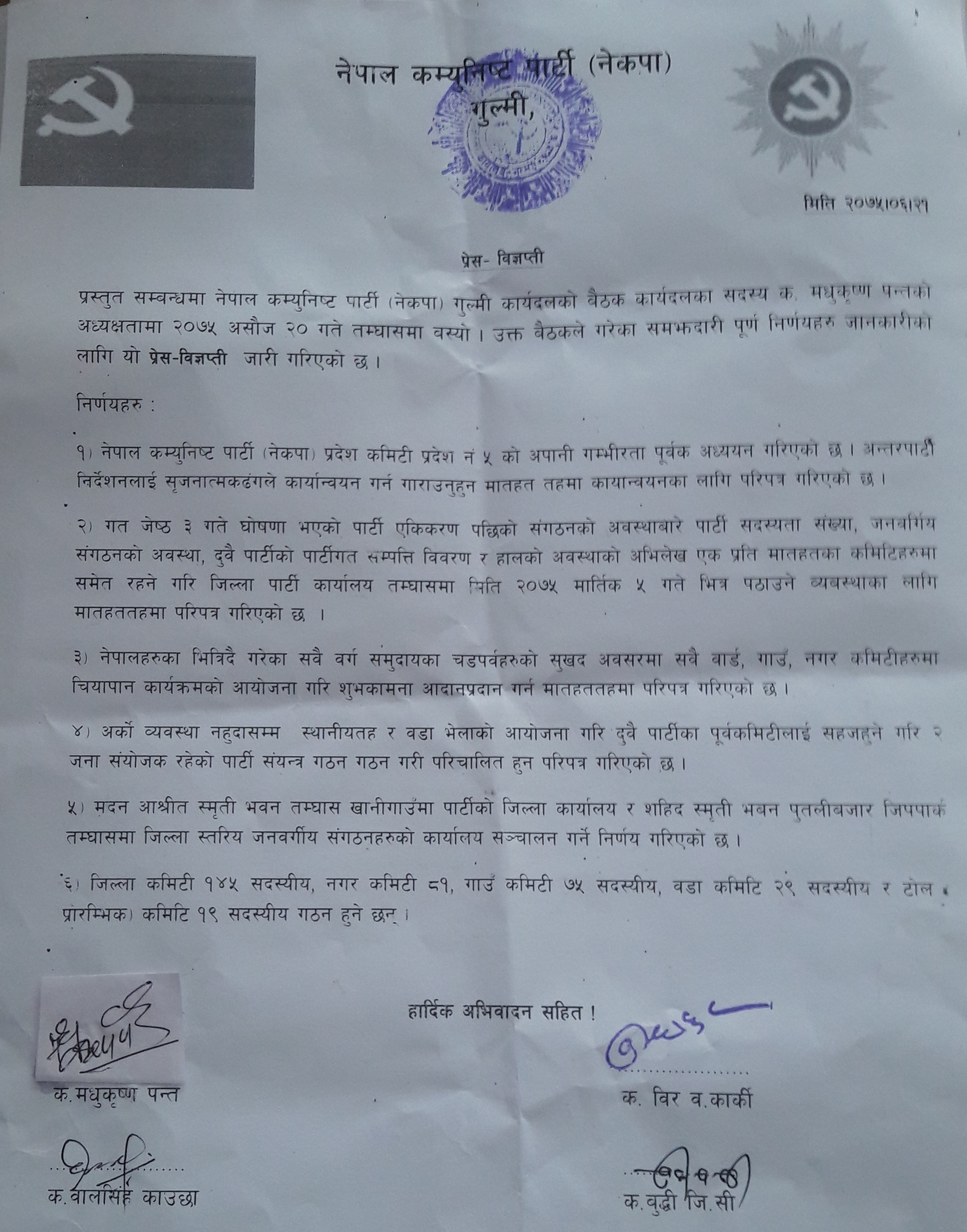 पार्टीको जिल्ला कमिटी १४५ जनाको, नगर कमिटी ८१ जनाको, गाउँ कमिटी ७५ जनाको, वडाकमिटी २९ जनाको र टोलकमिटी १९ जनाको गठन हुने विज्ञप्तिमा जनाइएको छ ।