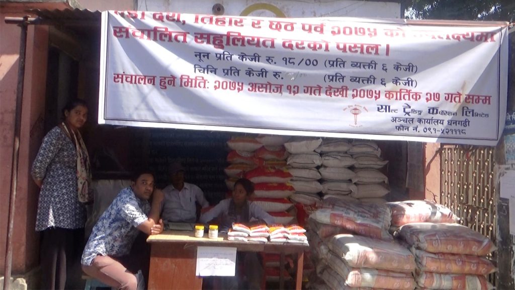 २३ असोज, कैलाली । साल्ट टे्रडिङ कर्पोरेसन क्षेत्रीय कार्यालय धनगढीले दशै तिहारको अवसरमा सञ्चालन गरेको सहुलियत पसलमा चिनी बिक्री गरेको छैन ।