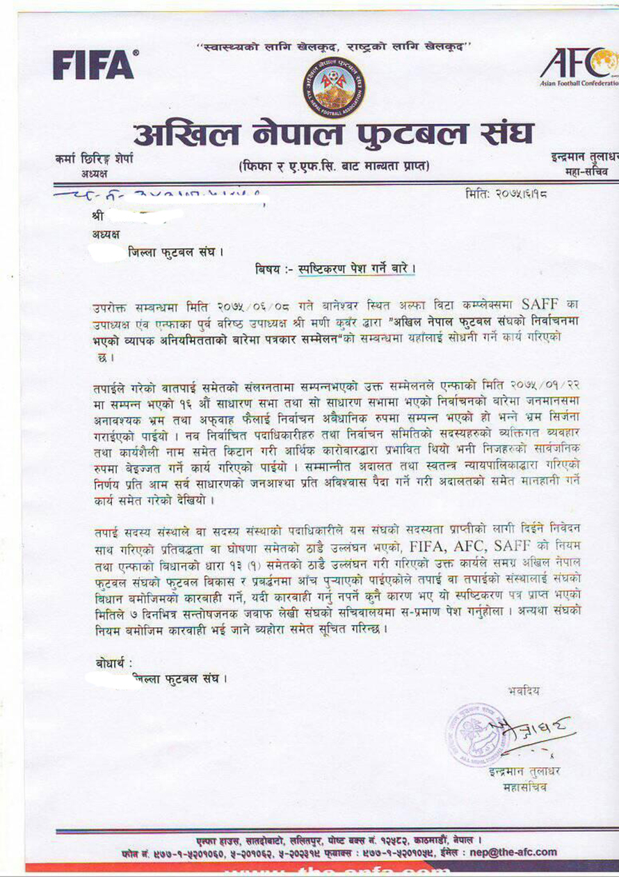 एन्फाले भक्तपुर जिल्ला अध्यक्ष गौतम सुजुख, काठमाडौंका विराट शाही, ललितपुरका पुरुषोत्तम भण्डारी, सिरहाका प्रवीण यादवलगायतलाई स्पष्टीकरण सोधेको हो । सुजखुले एन्फाको पत्र १८ गते प्राप्त भएको स्वीकार गर्दै भने, ‘एन्फाको विरोध गरेको होइन । आफ्नो मत राख्न पाउनु मेरो प्रजातान्त्रिक अधिकार हो भनेर बुधबार मात्र जवाफ पठाएको छु ।’