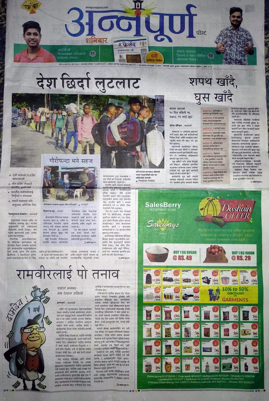 अन्नपूर्ण पोष्ट दैनिकले दशैंको बेला घर फर्किनेहरु सीमा क्षेत्रमा लुटिएको समाचारलाई पहिलो प्राथमिकताका साथ छापेको छ । ‘देश छिर्दा लुटलाट’ शीर्षकको समाचारमा गड्डाचौकी नाकामा भारतीय सुरक्षाकर्मीले ठाउँठाउँमा खानतलासी गर्दै दुःख दिने र पैसा माग्ने गरेको उल्लेख छ । समाचारमा लेखिएअनुसार बनबासादेखि गड्डाचौकीसम्म पुग्दा पाँच ठाउँमा झोला खोतलिएको र पटकपटक कम्तिमा २० रुपैयाँदेखि बढीमा दुई सय रुपैयाँसम्म भारतीय सुरक्षाकर्मीलाई बुझाउनुपर्ने बाध्यता रहेको छ ।