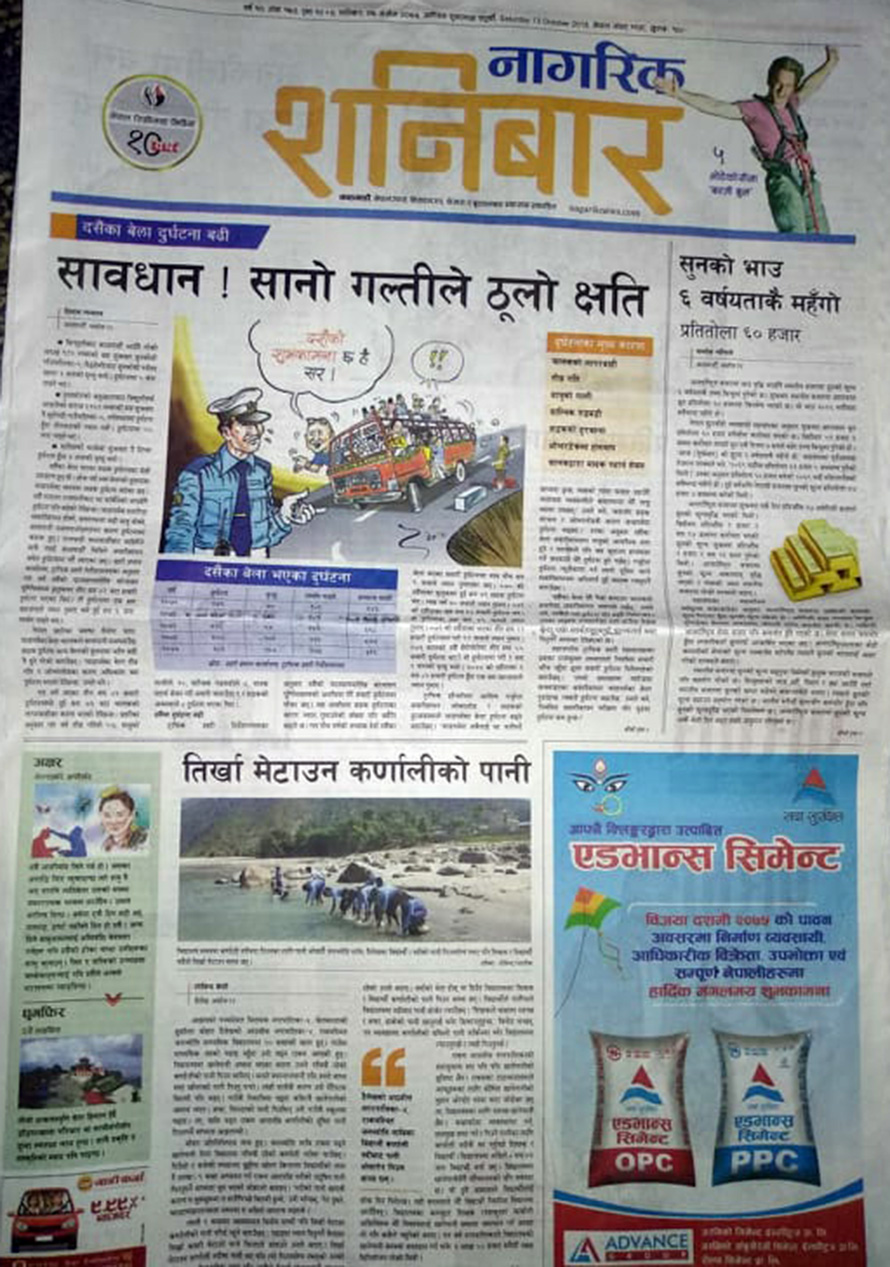 नागरिक दैनिकले दशैंका बेला दुर्घटना बढी भएका समाचारलाई पहिलो समाचारको रुपमा छापेको छ । २०७० सालदेखि २०७४ सालसम्मका दुर्घटना विवरणलाई समेटेर तयार पारिएको समाचारमा चालकको सानो गल्तीले ठूलो दुर्घटना हुने गरेको उल्लेख छ ।