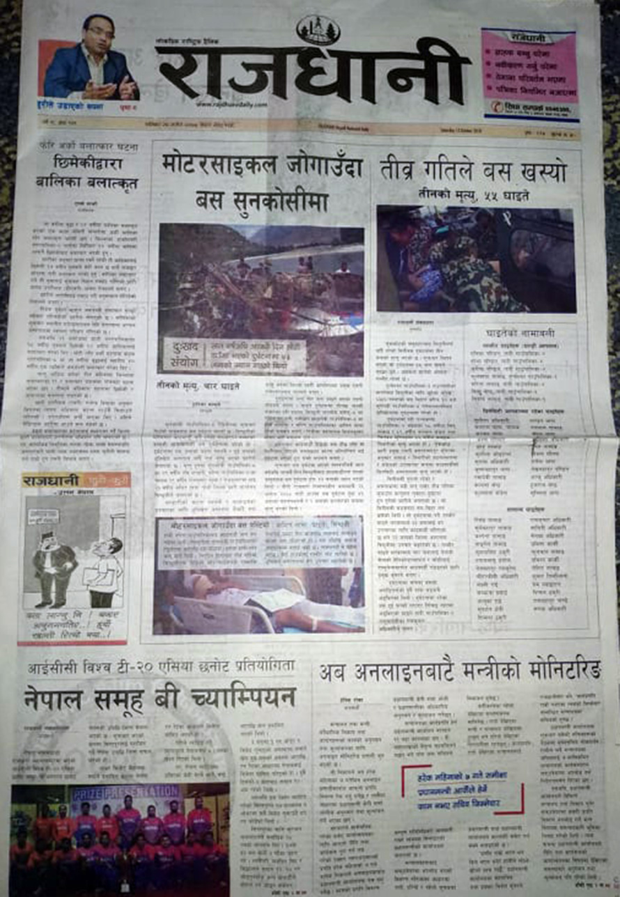 राजधानी दैनिकले शुक्रबार सिन्धुली र नुवाकोटमा भएका बस दुर्घटनाका समाचारलाई पहिलो प्राथमिकताका साथ छापेको छ । साथै सप्तरीमा १४ वर्षीया बालिका बलात्कृत भएको समाचारलाई पनि महत्व दिइएको छ ।