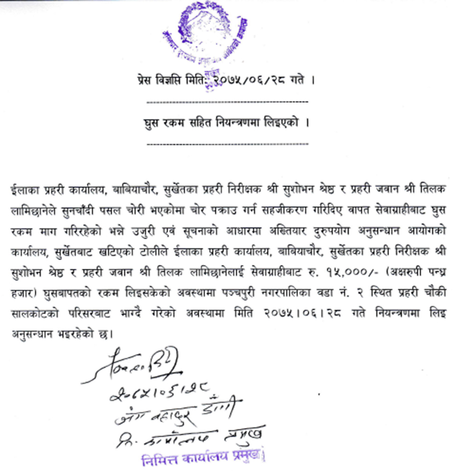 इन्सपेक्टर श्रेष्ठ र जवान लामिछानेले सोही नगरपालिकाको वडा नं. २ को सालकोट प्रहरी चौकीमा सेवाग्राहीबाट घुस लिएको अख्तियारले जनाएको छ ।