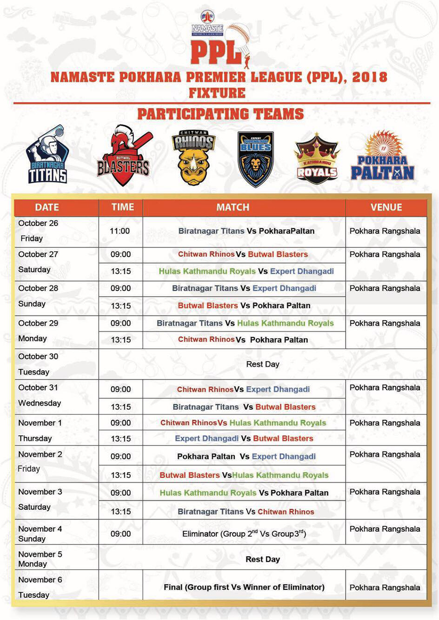 आयोजक क्विन्स इभेन्ट्स म्यानेजमेन्टले खेल तालिका सार्वजनिक गरेको हो, जसअनुसार कर्तिक ९ गते हुने उद्घाटन खेलमा विराटनगर टाइटन्सले पोखरा पल्टनसँग प्रतिस्पर्धा गर्ने छ ।