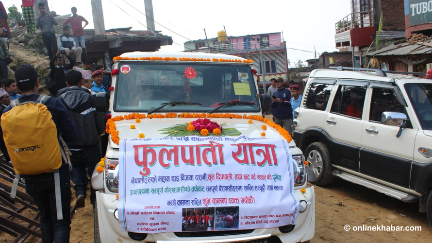 ३० असोज, गोरखा । गोरखा दरबारबाट काठमाडौंमा फूलपाती पठाइएको छ । गोरखा नगरपालिकाको आर्थिक सहयोग, गोरखा दरबार हेरचाह अड्डा, गोरखा पर्यटन बिकास केन्द्र एवं पर्यटन सूचना केन्द्र र सतिपिपल क्लबको समन्वयमा विहानै गोरखा दरबारबाट बाजागाजासहित डोलीमा राखेर फूलपाती लगिएको हो ।