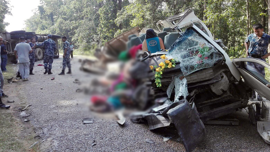 ३० असोज, काठमाडौं । दशैंको मुखमै पूर्व-पश्चिम राजमार्गअन्तर्गत बाँकेको राप्तीसोनारी गाउँपालिकामा गतसाता ट्रक र माइक्रो बस ठोक्किँदा चार जनाको ज्यान गयो । निकै भायानक तवरले भएको यो दुर्घटनामा दर्जनभन्दा बढी घाइते भए । दशैं नजिकिएसँगै नेपालमा यस्ता सवारी दुर्घटनाको क्रम बढ्ने गरेको छ । अब घटस्थापनापछि बसपार्कहरुमा घर फर्किनेको लर्को लाग्छ, त्यसपछि दुर्घटनाको संख्या पनि ह्वात्तै बढ्छ ।