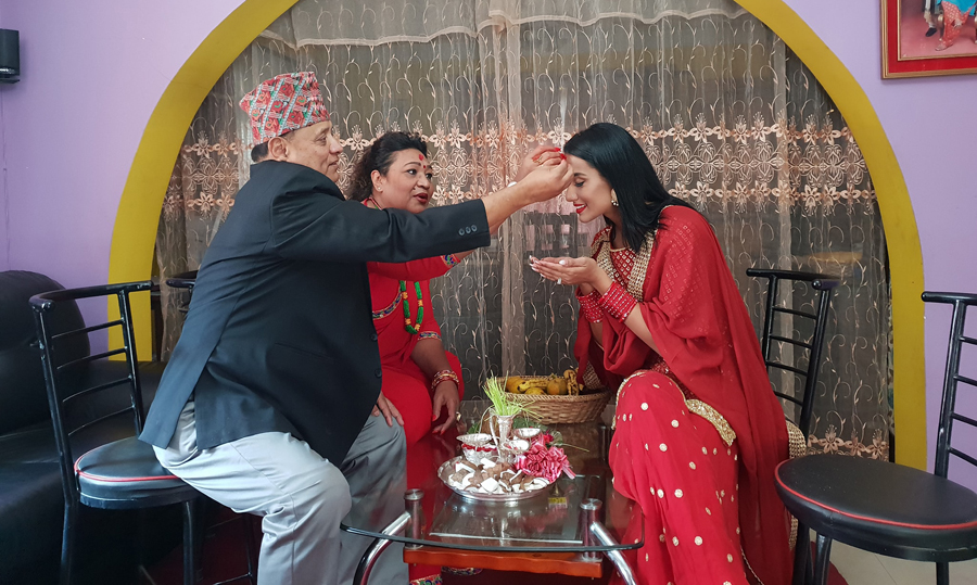 तेस्रो पुस्ताकी अभिनेत्री साम्राज्ञी राज्यलक्ष्मी शाह आफ्ना समकक्षीभन्दा एक कदम अघि छिन् । उनले रातो कुर्तामा रातै टिका र जमरा लगाएको तस्विर फेसबुकमा राखेकी छिन् । यसो भन्दै, ‘टिका २०७५’