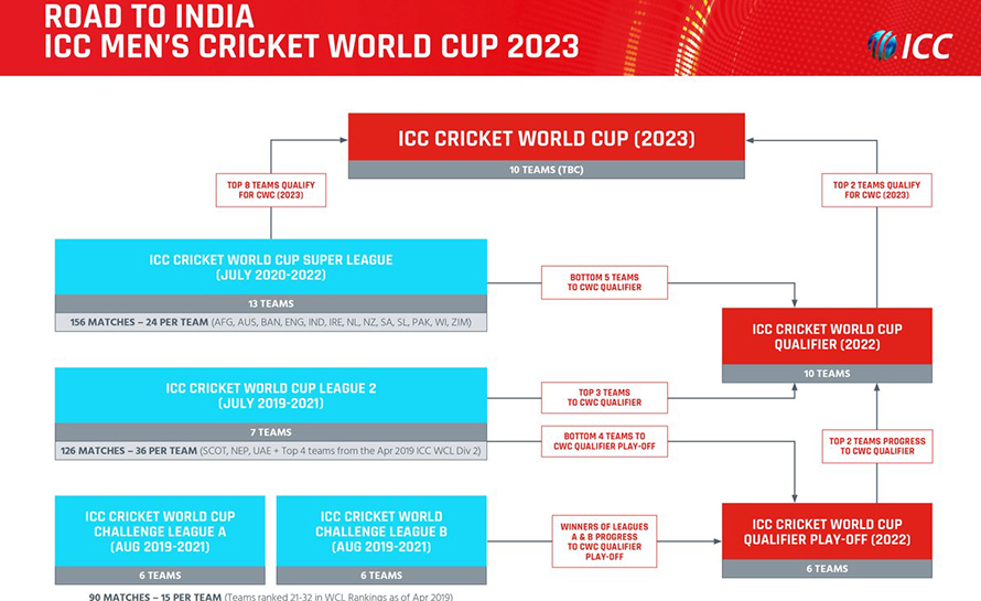 सन् २०२३ मा भारतमा हुने विश्वकप खेल्नका लागि नेपालले दुई चरण पार गर्नुपर्ने भएको छ । आईसीसीले तयार पारेको विश्वकपको नयाँ रोड म्यापअनुसार नेपाल अहिले आईसीसी लिग-२ मा रहेको छ ।