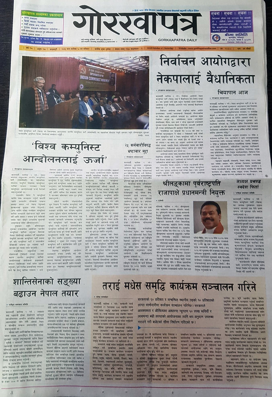 १० कात्तिक, काठमाडौं । आज शनिबार । संघीय राजधानी काठमाडौंबाट प्रकाशित पत्रिकाहरुमा शनिबारीय सामाग्रीसहित बिभिन्न समाचारहरु छन् । आज सत्तारुढ नेकपाले निर्वाचन आयोगबाट वैधानिकता पाएको समाचारले प्राथमिकता पाएको छ ।