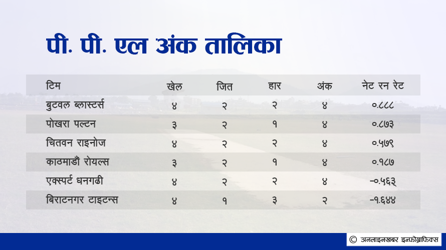बिहीबारको हारपछि पनि बुटवल शीर्ष स्थानमौ छ । नेट रन रेटलाई हेर्दा बुटवलको ०.८८८, पोखराको ०.८७३, चितवनको ०.५७९, काठमाडौंको ०.१८७, धनगढीको -०.५६३ र विराटनगरको -१.६४४ रहेको छ । यसैले कुनै पनि खेलले तालिकामा फेरबदल हुन सक्छ ।