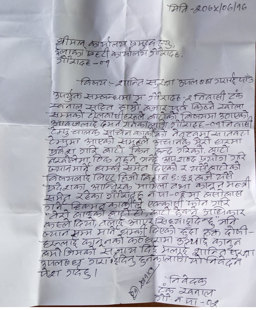 ‘हिजो बिहान ९ः३३ बजे यसै प्रदेशका आन्तरिक मामला तथा कानून मन्त्रीसमेत रहेका गौरादह नगरपालिका–३ मा बसोबास गर्ने हिक्मत कार्कीले एक्कासी फोन गरी तेरो बाउको बाटो हो ? बाटो छेक्ने अधिकार कसले दियो ? तँलाई आएर सिध्याइदिन्छु भनी ज्यान मार्ने धम्की दिएको हुँदा निजलाई कानूनको कठघरामा उभ्याइपाउँ,’ उजुरीमा निवेदकले भनेका छन् ।