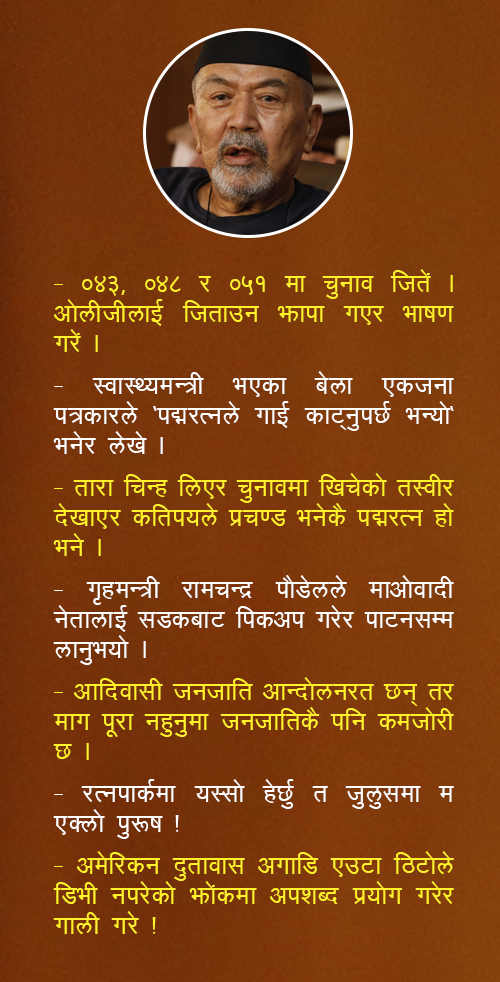 अहिले पनि सम्झनुभएको भए त नेकपाको अध्यक्ष नै हुनुहुन्छ । शिक्षामन्त्री पनि उहाँकै निकट नेता हुनुहुन्छ । निर्देशन दिन सक्नुहुन्छ । मसँग प्रचण्ड जतिसुकै नजिक भए पनि मेरो त्यो कुरा लागु भएन । एउटै कुरा दोहोर्याएर भन्ने मेरो स्वाभाव छैन ।