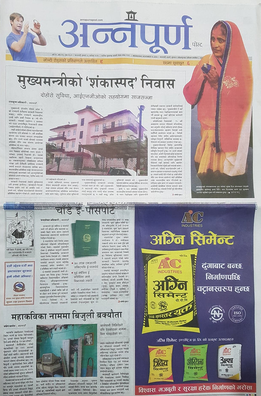 अन्नपूर्णले आज ‘मुख्यमन्त्रीको शंकास्पद निवास’ शीर्षक दिएर मुख्य समाचार छापेको छ । प्रदेश ३ का मुख्यमन्त्री डोरमणि पौडेल बस्दै आएको सरकारी निवासबारे अन्नपूर्णले समाचार लेखेको हो ।