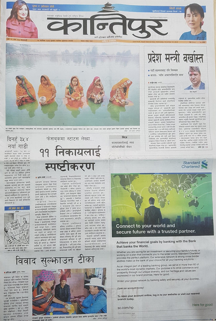 २८ कात्तिक, काठमाडौं । राजधानी काठमाडौंबाट आज प्रकाशित राष्ट्रिय दैनिक पत्रिकाहरुले सुदूरपश्चिम प्रदेशका सामाजिक विकासमन्त्री दीर्घ सोडारी बर्खास्त भएकोदेखि फेसबुकमा स्ट्याटस लेख्दा सरकारले ११ निकायलाई स्पष्टीकरण बुझाउन लगाएकोसम्मका खबर छन् ।