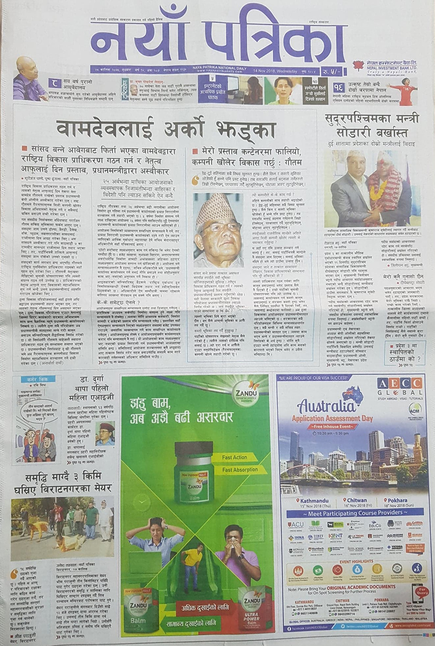नयाँ पत्रिका दैनिकले आज सांसद् बन्ने आवेगबाट फिर्ता भएका वामदेव गौतमले राष्ट्रिय विकास प्राधिकरण गठन गर्न र नेतृत्व आफूलाई दिन गरेको प्रस्ताव प्रधानमन्त्री केपी शर्मा ओलीले इन्कार गरेकोलाई आज नयाँ पत्रिकाले मुख्य समाचार बनाएको छ ।