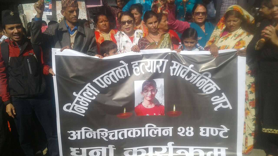 उता, निर्मलाका बुबा यज्ञराज पन्त र आमा दुर्गादेवी भने न्यायको माग गर्दै धर्ना बसेका छन् । जिल्ला प्रशासन कार्यालय अगाडि उनीहरु धर्ना बसेका हुन् ।